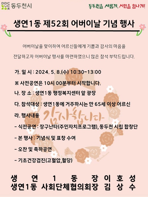 µ¿µÎõ½Ã »ý¿¬1µ¿ ÇàÁ¤º¹Áö¼¾ÅÍ(µ¿Àå ÀÌÈ£¼º)´Â 5¿ù 8ÀÏ Á¦52ȸ ¾î¹öÀ̳¯À» ¸Â¾Æ ¾î¸£½Å 500¿© ¸íÀ» ¸ð½Ã°í ‘¾î¹öÀ̳¯ ±â³äÇà»ç’¸¦ °³ÃÖÇÑ´Ù.