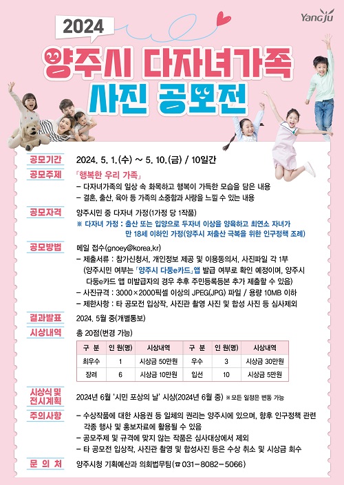 ¾çÁÖ½Ã(½ÃÀå °¼öÇö)´Â 5¿ù °¡Á¤ÀÇ ´ÞÀ» ¸Â¾Æ °¡Á·ÀÇ ¼ÒÁßÇÔÀ» ´À³¥ ¼ö ÀÖ´Â °è±â¸¦ ¸¶·ÃÇϰí, °áÈ¥·ÀӽŷÃâ»ê¿¡ ´ëÇÑ ±àÁ¤Àû Àνݳ¼± ¹× °¡Á· Ä£ÈÀûÀÎ »çȸ ºÐÀ§±â¸¦ Á¶¼ºÇϱâ À§ÇØ ‘´ÙÀڳడÁ· »çÁø °ø¸ðÀü’À» °³ÃÖÇÑ´Ù.