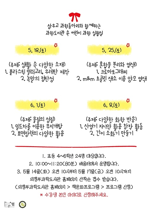 5¿ù 14ÀÏ ¿ÀÀü 10½ÃºÎÅÍ °úÇеµ¼°ü ȨÆäÀÌÁö(http://www.uilib.go.kr/science)¿¡¼ Âü°¡ ÇлýÀÇ ¾ÆÀ̵ð·Î ½ÅûÇÏ¸é µÈ´Ù. ÀÚ¼¼ÇÑ ³»¿ëÀº ȨÆäÀÌÁö¸¦ Âü°íÇϰųª ÀüÈ(031-828-8657)·Î ¹®ÀÇÇÏ¸é ¾È³»¹ÞÀ» ¼ö ÀÖ´Ù.
