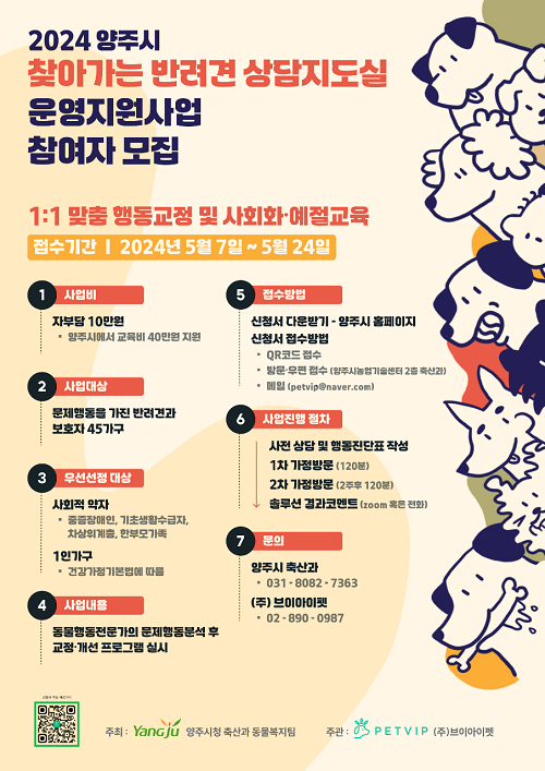 Âü¿© ½ÅûÀº ¿À´Â 24ÀϱîÁö ¹æ¹®·¿ìÆí Á¢¼ö(¾çÁֽà ±¤Àû¸é Áö¼¶·Î 162, Ãà»ê°ú), À̸ÞÀÏ Á¢¼ö(petvip@naver.com), QRÄÚµå Á¢¼ö(Æ÷½ºÅÍ ³»)¸¦ ÅëÇÏ¿© ÇÒ ¼ö ÀÖÀ¸¸ç ½Åû ¼·ù ¼½Ä µî »ç¾÷¿¡ ´ëÇÑ ¹®ÀÇ´Â ¾çÁֽà Ãà»ê°ú µ¿¹°º¹ÁöÆÀ(031-8082-7363) ¹× ¾çÁֽà ȨÆäÀÌÁö °í½Ã°ø°í¶õ µîÀ» ÅëÇÏ¿© È®ÀÎÇÒ ¼ö ÀÖ´Ù.