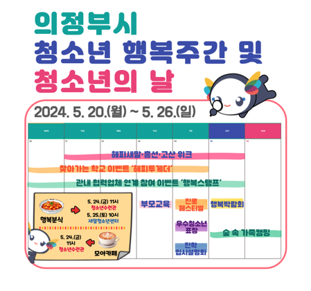 ÀÇÁ¤ºÎ½Ãû¼Ò³âÀç´Ü(ÀÌ»çÀå ±èµ¿±Ù)Àº“Á¸Á߹޴ û¼Ò³â, ÇÔ²² ¿ô´Â û¼Ò³â”À̶ó´Â ½½·Î°Ç°ú ÇÔ²² ¿À´Â 5¿ù 20ÀϺÎÅÍ 26ÀϱîÁö ÀÇÁ¤ºÎ½Ã û¼Ò³âµéÀ» À§ÇÑ ´Ùä·Î¿î Çà»ç¸¦ ÁøÇàÇÑ´Ù.