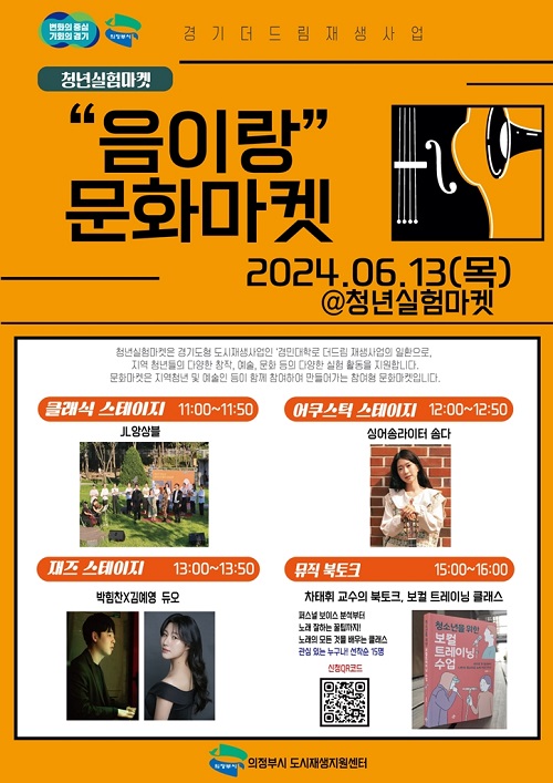 ÀÇÁ¤ºÎ½Ã(½ÃÀå ±èµ¿±Ù) µµ½ÃÀç»ýÁö¿ø¼¾ÅÍ´Â °æ¹Î´ëÇзΠ»ó±Ç Ȱ¼ºÈ¸¦ À§ÇØ 6¿ù 13ÀÏ ¿ÀÀü 11½ÃºÎÅÍ ¿ÀÈÄ 4½Ã±îÁö °æ¹Î´ëÇзΠ»ó°¡°Å¸®¿¡¼ û³â½ÇÇ踶ÄÏ ‘Á¦1ȸ À½À̶û ¹®È¸¶ÄÏ’À» °³ÃÖÇÑ´Ù.