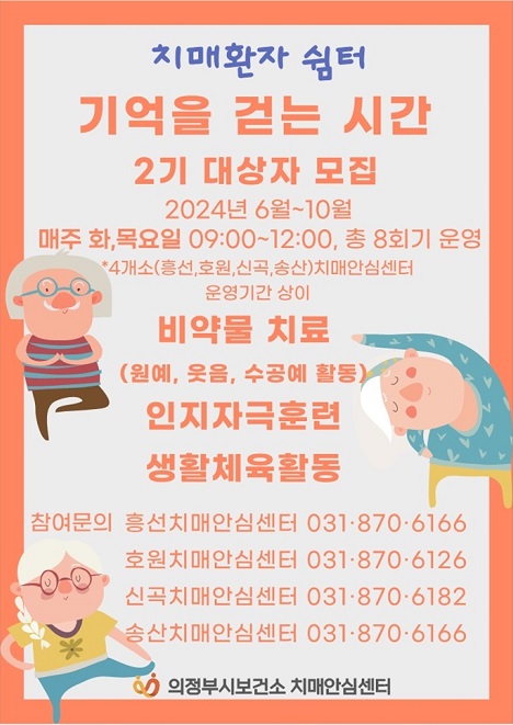 ÀÇÁ¤ºÎ½Ã º¸°Ç¼Ò(¼ÒÀå À忬±¹) Ä¡¸Å¾È½É¼¾ÅÍ´Â 6¿ù ¸»ºÎÅÍ °æµµ Ä¡¸Å·Î Áø´Ü¹ÞÀº ÁÖ¹ÎÀ» ´ë»óÀ¸·Î Ä¡¸ÅȯÀÚ ½°ÅÍ ‘±â¾ïÀ» °È´Â ½Ã°£’ 2±â¸¦ ¿î¿µÇÑ´Ù.