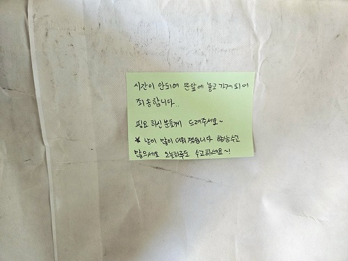 À͸íÀÇ ±âºÎÀÚ´Â ‘ÇÊ¿äÇϽŠºÐµé²² ÀüÇØ´Þ¶ó’´Â ³»¿ëÀÌ ´ã±ä ÂÊÁö¿Í ÇÔ²² ¹é¹Ì(10kg ´ÜÀ§) 3Æ÷¸¦ Áֹμ¾ÅÍ¿¡ ±âŹÇß´Ù.