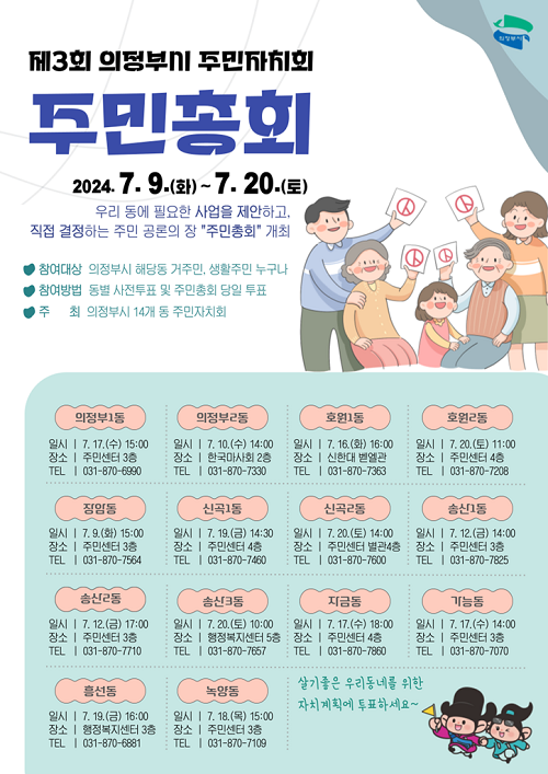 ÀÇÁ¤ºÎ½Ã(½ÃÀå ±èµ¿±Ù)´Â 7¿ù 9ÀϺÎÅÍ 20ÀϱîÁö 14°³ µ¿º° ÀÏÁ¤¿¡ µû¶ó °¢ µ¿ ÁÖ¹ÎÀÚġȸ ÁÖÃÖ·Î ‘ÁÖ¹ÎÃÑȸ’¸¦ °³ÃÖÇÑ´Ù.
