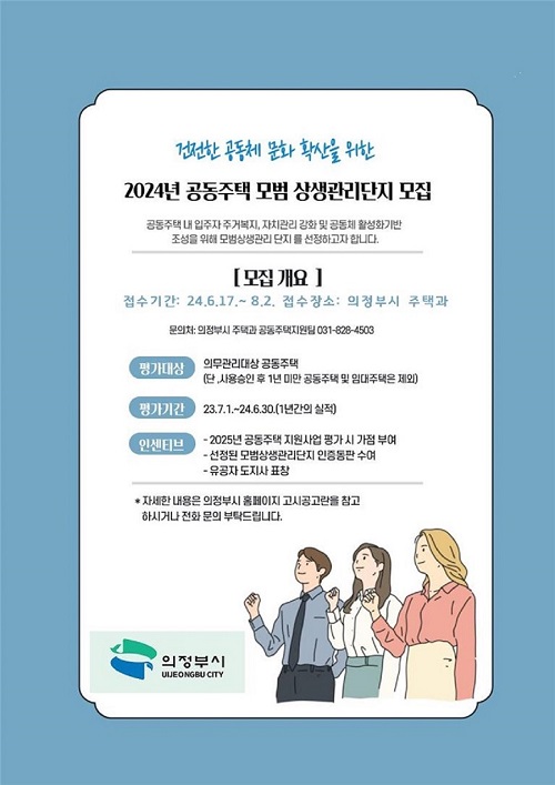 ÀÇÁ¤ºÎ½Ã(½ÃÀå ±èµ¿±Ù)´Â °æ±âµµ°¡ ½ÃÇàÇÏ´Â ‘2024³â °øµ¿ÁÖÅà ¸ð¹ü‧»ó»ý°ü¸®´ÜÁö’ ¹× ‘ÂøÇÑ¾ÆÆÄÆ®’¸¦ ¼±Á¤Çϱâ À§ÇØ 8¿ù 2ÀϱîÁö Âü¿© ½ÅûÀ» ¹Þ´Â´Ù.