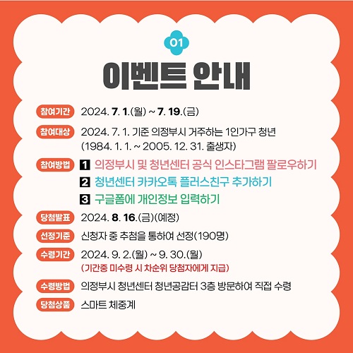 Áö¿ø ´ë»óÀº 2024³â 7¿ù 1ÀÏ ±âÁØ ÀÇÁ¤ºÎ½Ã¿¡ °ÅÁÖÇÏ´Â 19~39¼¼ 1Àΰ¡±¸ û³âÀÌ´Ù. ½Åû ¹æ¹ýÀº ÀÇÁ¤ºÎ½Ã °ø½Ä ÀνºÅ¸±×·¥¿¡¼ ¡ãÀÇÁ¤ºÎ½Ã ¹× û³â¼¾ÅÍ °ø½Ä ÀνºÅ¸±×·¥ ÆÈ·Î¿ì ¡ãû³â¼¾ÅÍ Ä«Ä«¿ÀÅå Ç÷¯½ºÄ£±¸ Ãß°¡ ¡ã±¸±ÛÆû¿¡ °³ÀÎÁ¤º¸ ÀÔ·Â ÃÑ 3°¡Áö¸¦ ¿Ï·áÇÏ¸é µÈ´Ù.