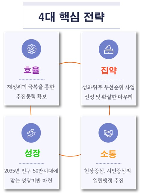 4´ë ÇÙ½É Àü·«Àº ¡ãÀçÁ¤À§±â ±Øº¹À» ÅëÇÑ ÃßÁøµ¿·Â È®º¸¸¦ À§ÇÑ ‘È¿À²’ ¡ã¼º°úÀ§ÁÖ ¿ì¼±¼øÀ§ »ç¾÷ ¼±Á¤ ¹× È®½ÇÇÑ ¸¶¹«¸® ‘Áý¾à’ ¡ã2035³â Àα¸ 50¸¸ ½Ã´ë¿¡ ¸Â´Â ±â¹Ý ¸¶·Ã‘¼ºÀå’ ¡ãÇöÀåÁß½É, ½Ã¹ÎÁß½ÉÀÇ ¿¸°ÇàÁ¤ ÃßÁø ‘¼ÒÅë’ÀÌ´Ù.