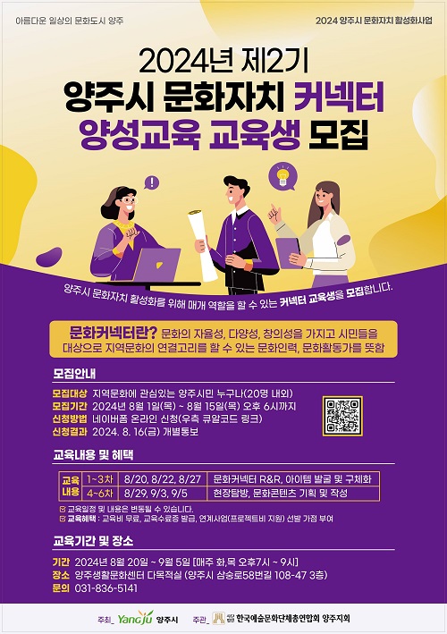 ¾çÁÖ½Ã(½ÃÀå °¼öÇö)°¡ ¿À´Â 15ÀϱîÁö ½Ã°¡ ÁÖÃÖÇϰí Çѱ¹¿¹¼ú¹®È´ÜüÃÑ¿¬ÇÕȸ ¾çÁÖÁöȸ(ȸÀå ¼¼ø¿À)°¡ ÁÖ°üÇÑ ‘2024³â Á¦2±â ¹®È ÀÚÄ¡ Ä¿³ØÅÍ ¾ç¼º ±³À°’ ±³À°»ýÀ» ¸ðÁýÇÑ´Ù°í ¹àÇû´Ù.