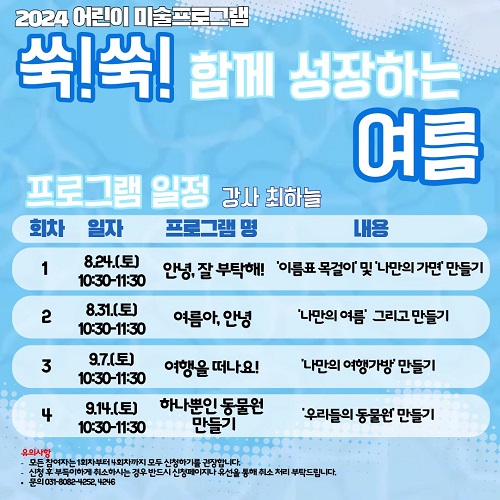 ¾çÁֽø³¹Ì¼úâÀÛ½ºÆ©µð¿À¿¡¼ ÁøÇàÇÏ´Â ‘¾¦!¾¦! ÇÔ²² ¼ºÀåÇÏ´Â ¿©¸§’Àº ¡ãÀ̸§Ç¥ ¸ñ°ÉÀÌ ¸¸µé±â, ¡ã³ª¸¸ÀÇ ¿©Çà °¡¹æ ¸¸µé±â µî À¯¾ÆµéÀÌ Èï¹Ì¸¦ °®°í ¹Ì¼ú ³îÀÌ¿¡ Àû±Ø Âü¿©ÇÒ ¼ö ÀÖ´Â ÇÁ·Î±×·¥À¸·Î ±¸¼ºµÆ´Ù.