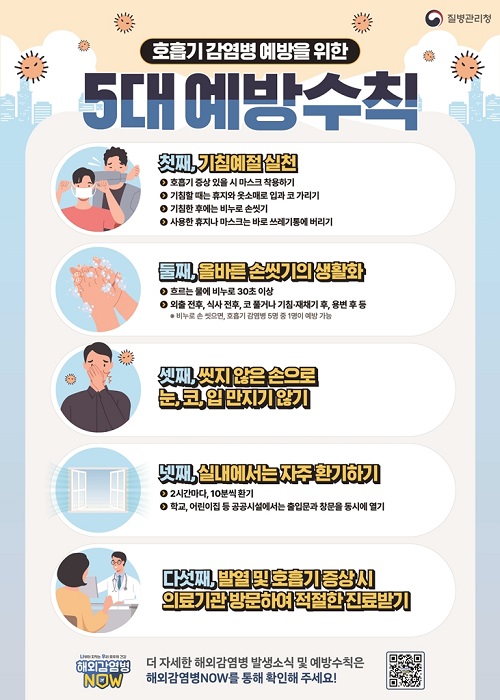È£Èí±â °¨¿°º´ ¿¹¹æÀ» À§Çؼ´Â ¡ã±âħÇÒ ¶§¿¡´Â ¿Ê¼Ò¸Å·Î °¡¸®±â ¡ãÈ帣´Â ¹°¿¡ ºñ´©·Î 30ÃÊ ÀÌ»ó ¼Õ¾Ä±â ¡ã¾ÄÁö ¾ÊÀº ¼ÕÀ¸·Î ´«·ÄÚ·ÀÔ ¸¸ÁöÁö ¾Ê±â ¡ã½Ç³»¿¡¼´Â ÀÚÁÖ È¯±âÇϱ⠡ã¹ß¿ ¹× È£Èí±â Áõ»ó ½Ã ¹Ù·Î ÀÇ·á±â°ü ¹æ¹®Çϱ⠵î 5´ë ¿¹¹æ¼öÄ¢À» ÁöÄÑ¾ß ÇÑ´Ù.