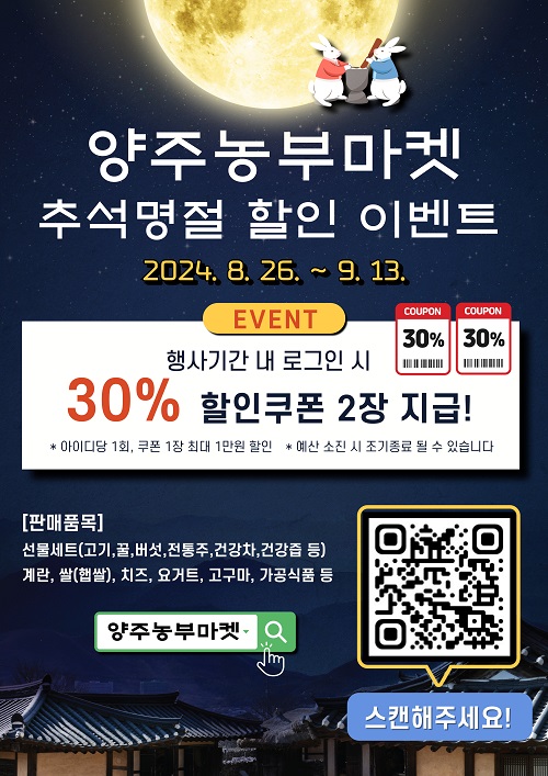 ¾çÁÖ½Ã(½ÃÀå °¼öÇö)°¡ ¿î¿µÇÏ´Â ¾çÁֽà ³óÃà»ê¹° ¿Â¶óÀÎ ¼îÇθô ‘¾çÁÖ³óºÎ¸¶ÄÏ’¿¡¼ Ãß¼®¸ÂÀÌ Æ¯º° ÇÒÀÎ À̺¥Æ®¸¦ ÁøÇàÇÑ´Ù.