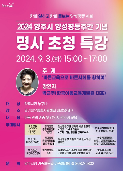 ¿µÀ¯¾ÆÀÇ ±Ç¸®¸¦ Á¸ÁßÇÏ°í ¼ºÀÎÁö °¨¼ö¼ºÀ» ±â¹ÝÀ¸·Î ¿Ã¹Ù¸£°Ô ¾çÀ°ÇÏ´Â ¹æ¹ý ¹× ¼ºÂ÷º°À» ±Øº¹ÇÏ°í ³²¼º°ú ¿©¼ºÀÌ Á¶È·Î¿î »çȸ¸¦ ¸¸µéÀÚ´Â ¾ç¼ºÆòµîÁÖ°£ÀÇ ÃëÁö¿Í ¸Â¹°·Á ÇÑ Ãþ ´õ ÀǹÌÀÖ´Â °¿¬À¸·Î ÁøÇàµÉ ¿¹Á¤ÀÌ´Ù.