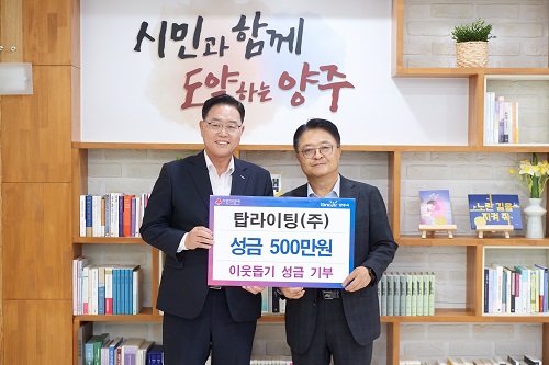 ¾çÁÖ½Ã(½ÃÀå °¼öÇö)°¡ 2ÀÏ ¿ÀÀü ž¶óÀÌÆÃ(ÁÖ)(´ëÇ¥ ±è¼®±Ô)¿¡¼ °ü³» ¾î·Á¿î ÀÌ¿ôÀ» À§ÇØ ½á´Þ¶ó¸ç ¼º±Ý 500¸¸ ¿øÀ» ±âºÎÇß´Ù°í ¹àÇû´Ù.