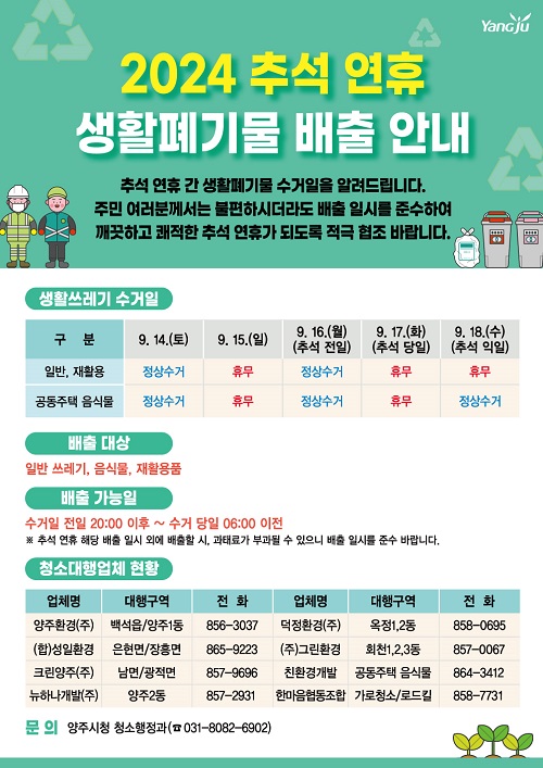 ¾çÁÖ½Ã(½ÃÀå °¼öÇö)°¡ ¿À´Â 14ÀϺÎÅÍ 18ÀϱîÁö ‘2024³â Ãß¼® ¿¬ÈÞ »ýȰ ¾²·¹±â °ü¸® ´ëÃ¥’À» ÃßÁøÇÑ´Ù°í ¹àÇû´Ù.