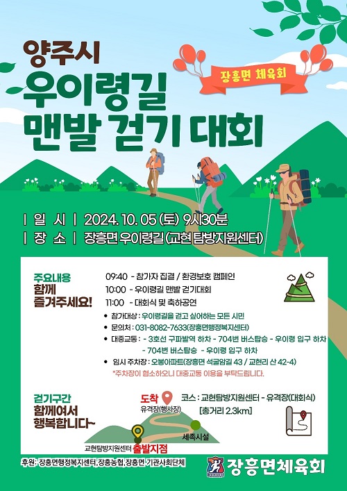 ¾çÁÖ½Ã(½ÃÀå °¼öÇö)°¡ ÀåÈï¸éüÀ°È¸(ȸÀå ±è¼ºÀç)¿¡¼ ½Ã¹Î °Ç° ÁõÁø ¹× ¿ìÀÌ·É È«º¸¸¦ À§ÇØ ‘2024³â ÀåÈï¸é ¿ìÀÌ·É ¸Ç¹ß °È±â´ëȸ’¸¦ ¿À´Â 10¿ù 5ÀÏ(Åä) °³ÃÖÇÑ´Ù.