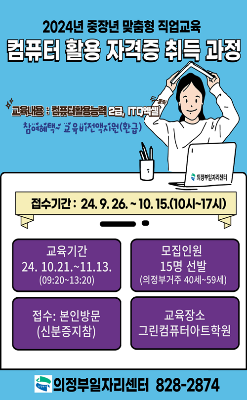 ÀÇÁ¤ºÎ½Ã(½ÃÀå ±èµ¿±Ù)´Â ÁßÀå³â ±¸Á÷ÀÚ¸¦ À§ÇÑ ¸ÂÃãÇü Á÷¾÷±³À° ÇÁ·Î±×·¥ÀÎ ‘ÄÄÇ»ÅÍ È°¿ë ÀÚ°ÝÁõ Ãëµæ °úÁ¤’ Âü¿©ÀÚ¸¦ ¸ðÁýÇÑ´Ù.