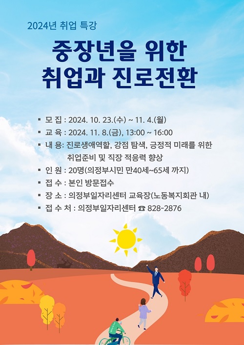 ÀÇÁ¤ºÎ½Ã(½ÃÀå ±èµ¿±Ù)´Â 11¿ù 8ÀÏ ÀÏÀÚ¸®¼¾ÅÍ¿¡¼ °ü³» °ÅÁÖ ÁßÀå³âÀ» ´ë»óÀ¸·Î ‘ÁßÀå³âÀ» À§ÇÑ Ãë¾÷°ú Áø·ÎÀüȯ’ Ư°À» ½Ç½ÃÇÑ´Ù.
