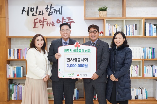 ¾çÁÖ½Ã(½ÃÀå °¼öÇö)°¡ Áö³ 20ÀÏ ÇÑ»ç¶ûºÀ»çȸ(ȸÀå ¹Ú½ÃÇö)¿¡¼ ½ÃûÀ» ¹æ¹®ÇØ ¾çÁֽà ¾î·Á¿î ÀÌ¿ôÀ» À§ÇØ ½á´Þ¶ó¸ç ¼º±Ý 200¸¸¿øÀ» ±âºÎÇß´Ù°í ¹àÇû´Ù.