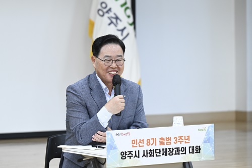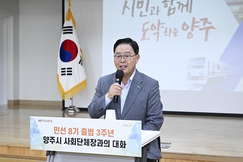 ¾çÁÖ½Ã(½ÃÀå °¼öÇö)°¡ 3ÀÏ ¿ÀÈÄ °ü³» ¿ÁÁ¤È£¼öµµ¼°ü ´ë°´ç¿¡¼ ‘¹Î¼± 8±â Ãâ¹ü 3Áֳ⠻çȸ´ÜüÀå°úÀÇ °£´ãȸ’¸¦ ¿°í Áö³ 3³â°£ÀÇ ½ÃÁ¤ ¼º°ú¸¦ °øÀ¯ÇÏ´Â ¶æ±íÀº ÀÚ¸®¸¦ ¸¶·ÃÇß´Ù.