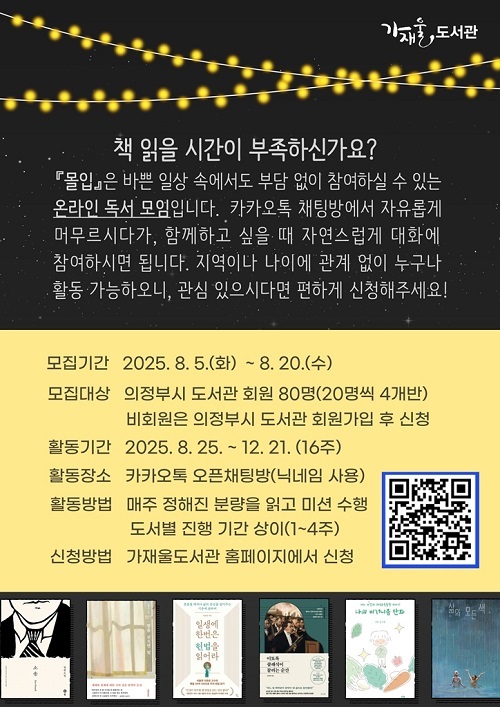 ÀÇÁ¤ºÎ°¡Àç¿ïµµ¼°üÀº 8¿ù 25ÀϺÎÅÍ 12¿ù 21ÀϱîÁö 16ÁÖ°£ 6±ÇÀÇ Ã¥À» ÇÔ²² ÀÐ°í °¨»óÀ» °øÀ¯ÇÏ´Â ¿Â¶óÀÎ µ¶¼Ã§¸°Áö ‘¸ôÀÔ’¿¡ ÇÔ²²ÇÒ 7±â Âü°¡ÀÚ¸¦ ¸ðÁýÇÑ´Ù.