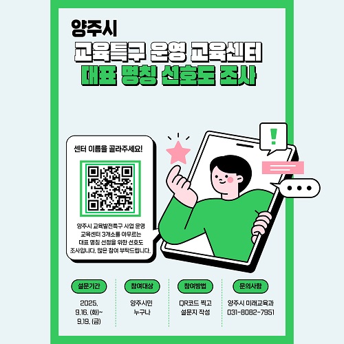 ¾çÁֽð¡ ±³À°¹ßÀüƯ±¸ ½Ã¹üÁö¿ª »ç¾÷À» ÅëÇØ Á¶¼ºÇÑ ±³À°¼¾ÅÍÀÇ ´ëÇ¥ ¸íĪ ¼±Á¤À» À§ÇØ ‘½Ã¹ÎÀÌ Á÷Á¢ »Ì´Â ³×ÀÌ¹Ö ¼±È£µµ Á¶»ç’¸¦ ¿À´Â 19ÀϱîÁö ½Ç½ÃÇÑ´Ù.