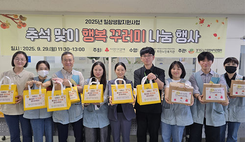¸íÀýÀ» ¾ÕµÐ 9¿ù 26ÀÏ º¹Áö°ü¿¡¼´Â ´ëÇлý ÀÚ¿øºÀ»çÀÚµéÀÌ ÇÔ²² ¸ð¿© dz¼ºÇÑ ÇѰ¡À§¸¦ ±â¿øÇϸç Çູ ²Ù·¯¹Ì Æ÷Àå Ȱµ¿À» ÁøÇàÇß´Ù. ÀÚ¿øºÀ»çÀÚµéÀº Áï¼®¹ä, µµ½Ã¶ô ±è, À¯°ú, Ä«·¹µ¤¹ä ¼Ò½º, ·¹Æ®·ÎÆ® Ȳű¹, ¼ÛÆí ¹× Àü ŰƮ·Î ±¸¼ºµÈ ²Ù·¯¹Ì¸¦ Á¤¼º²¯ Æ÷ÀåÇÏ¸ç ¸¶À½À» ´õÇß´Ù. ÀÌ·¸°Ô ÁغñµÈ ²Ù·¯¹Ì´Â Çà»ç ´çÀÏ º¹Áö°ü¿¡¼ Àü´ÞµÇ¾úÀ¸¸ç, ´çÀÏ ¼ö·ÉÀÌ ¾î·Á¿î ¾î¸£½ÅµéÀº 10¿ù 2ÀÏ(±Ý)±îÁö °³º° ¹æ¹®À» ÅëÇØ ²Ù·¯¹Ì¸¦ ¼ö·ÉÇÒ ¼ö ÀÖµµ·Ï ÁøÇàµÇ¾ú´Ù.