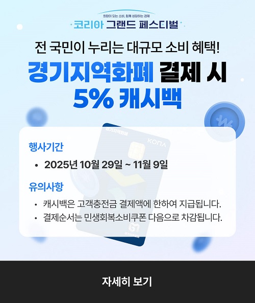 µ¿µÎõ½Ã(½ÃÀå ¹ÚÇü´ö)´Â 10¿ù 29ÀϺÎÅÍ 11¿ù 9ÀϱîÁö 'ÄÚ¸®¾Æ ±×·£µå Æä½ºÆ¼¹ú' ±â°£ µ¿¾È Áö¿ªÈÆó ‘µ¿µÎõ»ç¶ûÄ«µå’ °áÁ¦±Ý¾×ÀÇ 5%¸¦ ij½Ã¹éÀ¸·Î Áö±ÞÇÏ´Â À̺¥Æ®¸¦ ÁøÇàÇÑ´Ù°í ¹àÇû´Ù.