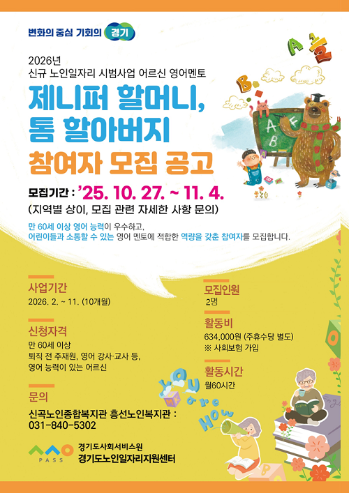 À̹ø ÇÁ·Î±×·¥Àº 2026³â °æ±âµµ ³ëÀÎÀÏÀÚ¸® Áö¿ø¼¾ÅÍ ½Ã¹ü»ç¾÷¿¡ Èï¼±³ëÀκ¹Áö°üÀÌ ¼±Á¤µÅ ÃßÁøÇÑ´Ù. ¿µ¾î ±¸»ç ´É·ÂÀÌ ¿ì¼öÇÑ ³ëÀεéÀÌ ¾î¸°À̵é°ú ¿µ¾î·Î ¼ÒÅëÇÏ¸ç ¸àÅä ¿ªÇÒÀ» ¼öÇàÇÏ´Â »çȸ°øÇåÇü ÀÏÀÚ¸®·Î, ¼¼´ë °£ ±³·ù¸¦ ÃËÁøÇÏ°í ³ëÀÎÀÇ »çȸ Âü¿© ±âȸ¸¦ È®´ëÇϱâ À§ÇØ ¸¶·ÃµÆ´Ù.