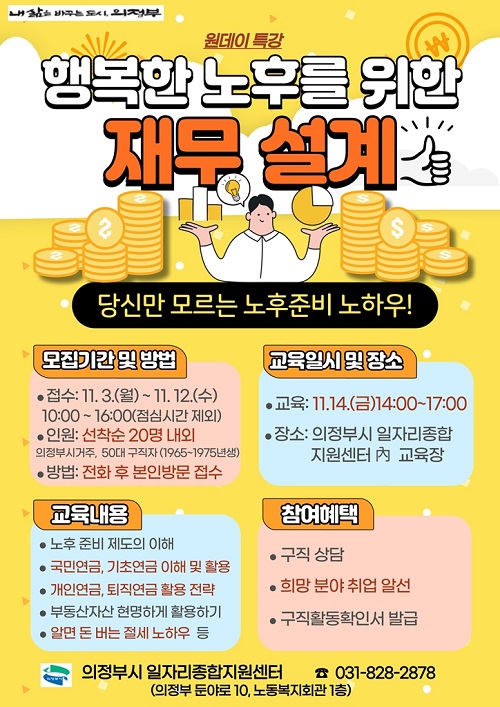 ÀÇÁ¤ºÎ½Ã(½ÃÀå ±èµ¿±Ù)´Â ±¸Á÷ÀÚÀÇ Ãë¾÷ µ¿±â °È¸¦ À§ÇØ ‘ÇູÇÑ ³ëÈĸ¦ À§ÇÑ À繫 ¼³°è’ Ư°À» 11¿ù 14ÀÏ ÀÇÁ¤ºÎ½Ã ÀÏÀÚ¸®Á¾ÇÕÁö¿ø¼¾ÅÍ¿¡¼ ½Ç½ÃÇÑ´Ù.