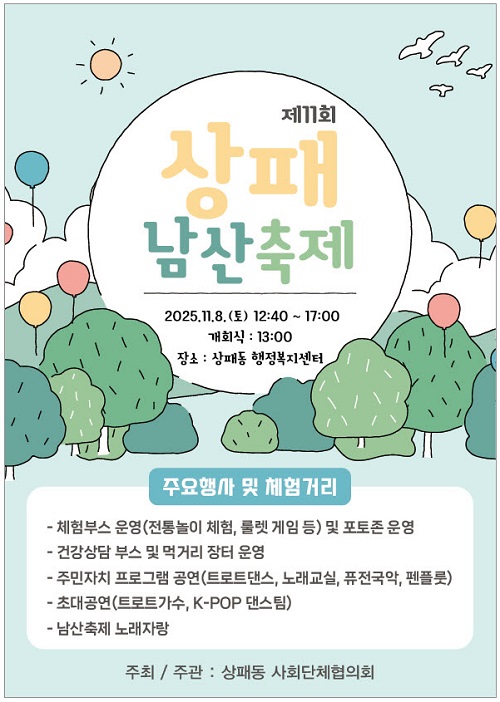 µ¿µÎõ½Ã »óÆÐµ¿ »çȸ´ÜüÇùÀÇȸ´Â ¿À´Â 11¿ù 8ÀÏ »óÆÐµ¿ ÇàÁ¤º¹Áö¼¾ÅÍ ÁÖÂ÷Àå¿¡¼ ‘Á¦11ȸ »óÆÐ ³²»êÃàÁ¦’¸¦ °³ÃÖÇÑ´Ù°í ¹àÇû´Ù.