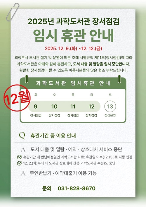 ÀÚ¼¼ÇÑ »çÇ×Àº ½Ã µµ¼°ü ´©¸®Áý(https://www.uilib.go.kr/science)À» Âü°íÇϰųª ÀüÈ(031-828-8670)·Î ¹®ÀÇÇϸé È®ÀÎÇÒ ¼ö ÀÖ´Ù.