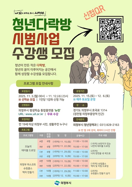 °¢ ÇÁ·Î±×·¥Àº ÁÖ 1ȸ 2½Ã°£¾¿ ÃÑ 2ȸ·Î ÁøÇàµÇ¸ç, û³â±âȹÀÚ°¡ Á÷Á¢ ¿î¿µÇÑ´Ù. Âü¿©¸¦ Èñ¸ÁÇÏ´Â ½Ã¹ÎÀº ÀÇÁ¤ºÎ½Ã Æò»ýÇнÀ ÅëÇÕÇ÷§Æû ‘´º·±’À» ÅëÇØ ¼±Âø¼øÀ¸·Î ½ÅûÇÒ ¼ö ÀÖ´Ù.