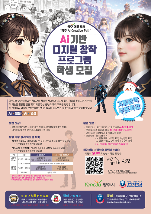 ¾çÁֽð¡ ¿À´Â 12ÀϺÎÅÍ ±³À°¹ßÀüƯ±¸ »ç¾÷ÀÇ ÀÏȯÀ¸·Î °æµ¿´ëÇб³¿Í ÇÔ²² ÀΰøÁö´É(AI) ±â¼úÀ» Ȱ¿ëÇÑ µðÁöÅÐ ÄÜÅÙÃ÷ Á¦ÀÛ ±³À° ÇÁ·Î±×·¥À» ¿î¿µÇϰí, Âü¿© ÇлýÀ» ¸ðÁýÇÑ´Ù.