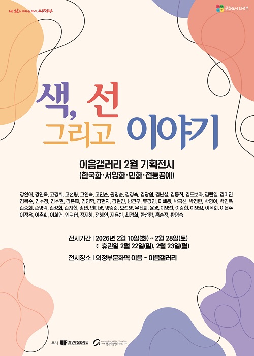 ÀÇÁ¤ºÎ¹®ÈÀç´Ü(´ëÇ¥ÀÌ»ç ¹ÚÈñ¼º)°ú Çѱ¹¹Ì¼úÇùȸ ÀÇÁ¤ºÎÁöºÎ(ÁöºÎÀå ±è¼±¿µ)´Â ÀÇÁ¤ºÎ Áö¿ªÀÛ°¡µéÀÌ Âü¿©ÇÏ´Â ±âȹÀü <»ö, ¼± ±×¸®°í À̾߱â>¸¦ ¼³ ¸íÀýÀ» ¸ÂÀÌÇØ ¿À´Â 2¿ù 10ÀϺÎÅÍ 2¿ù 28ÀϱîÁö ÀÇÁ¤ºÎ¹®È¿ª-ÀÌÀ½ ÀÌÀ½ °¶·¯¸®¿¡¼ °øµ¿ °³ÃÖÇÑ´Ù.