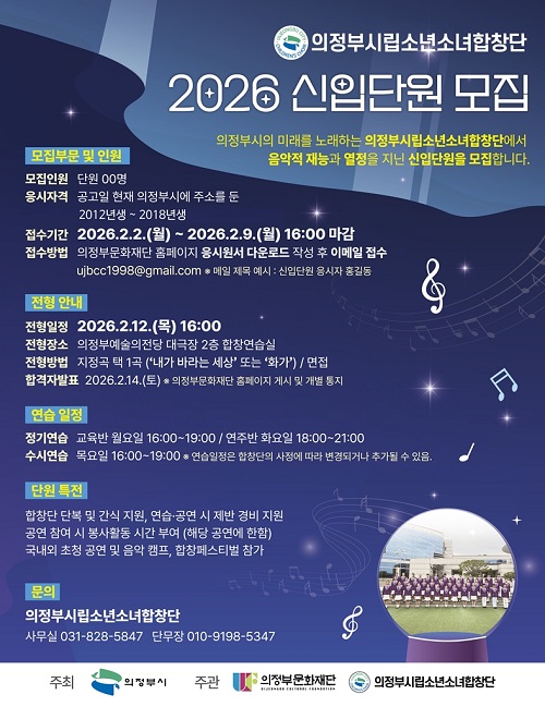 ¸ðÁý ´ë»óÀº ÀÇÁ¤ºÎ½Ã¿¡ °ÅÁÖÇÏ´Â 2012³âºÎÅÍ 2018³â»ý ¾Æµ¿·Ã»¼Ò³âÀ¸·Î, À½¾Ç¿¡ ´ëÇÑ °ü½É°ú ¿Á¤À» °®°í Á¤±â ¿¬½À¿¡ ¼º½ÇÈ÷ Âü¿©ÇÒ ¼ö ÀÖ´Ù¸é ´©±¸³ª Áö¿ø °¡´ÉÇÏ´Ù. ÀÀ½Ã¿ø¼´Â ÀÇÁ¤ºÎ¹®ÈÀç´Ü ´©¸®Áý¿¡¼ ³»·Á¹Þ¾Æ ÀÛ¼º ÈÄ ÀüÀÚ¿ìÆíÀ¸·Î Á¢¼öÇÏ¸é µÈ´Ù.