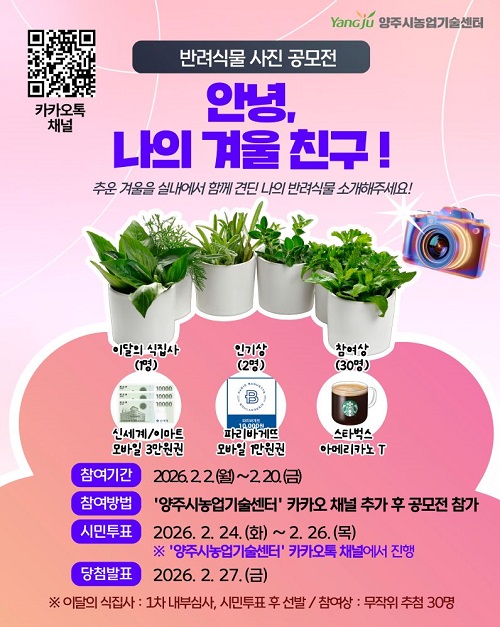 ¾çÁֽ𡠽ùεé°úÀÇ ¼ÒÅëÀ» °ÈÇÏ°í µµ½É ¼Ó ³ì»ö »ýȰ ½Çõ ¹®È¸¦ Á¶¼ºÇϱâ À§ÇØ 2¿ù 2ÀϺÎÅÍ ‘2026³â ¹Ý·Á½Ä¹° »çÁø °ø¸ðÀü’À» °³ÃÖÇÑ´Ù.