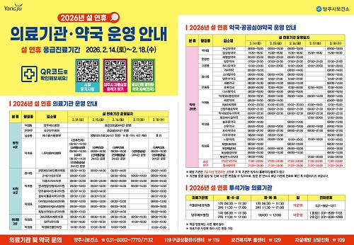 ¼³³¯ ¿¬ÈÞ ±â°£ ¿î¿µ ÀÇ·á±â°ü ¹× ¾à±¹ Á¤º¸´Â ¡ã¾çÁֽà º¸°Ç¼Ò(031-8082-7770, 7132) ¡ã119±¸±Þ»óȲ°ü¸®¼¾ÅÍ(119) ¡ãº¸°Çº¹ÁöºÎ Äݼ¾ÅÍ(129)¸¦ ÅëÇØ ¹®ÀÇÇÒ ¼ö ÀÖ´Ù.