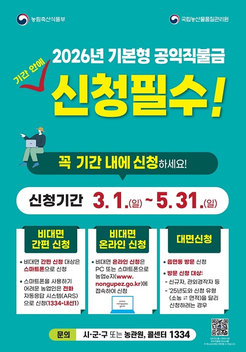 ºñ´ë¸é ½ÅûÀº ÀÚ°Ý ¿ä°Ç¿¡ ´ëÇÑ »çÀü °ËÁõ °á°ú°¡ Àû°ÝÇÑ ³ó¾÷ÀÎÀÌ ´ë»óÀÌ´Ù. ½º¸¶Æ®Æù °£Æí ½ÅûÀ̳ª ÀüÈ ÀÚµ¿ÀÀ´ä ½Ã½ºÅÛ(1334, ³»¼± 1¹ø), ³ó¾÷eÁö(www.nongupez.go.kr)·Î ½ÅûÇÒ ¼ö ÀÖ´Ù. ´Ù¸¸, 2025³â ±âº»Á÷ºÒ µî·ÏÁ¤º¸¿Í 2026³â ³ó¾÷°æ¿µÃ¼ µî·ÏÁ¤º¸ÀÇ º¯µ¿ÀÌ ÀÖ´Â °æ¿ì¿¡´Â ³ó¾÷eÁö·Î¸¸ ½ÅûÇÒ ¼ö ÀÖÀ¸¸ç, ½Å±Ô ½ÅûÀÚ·°ü¿Ü °æÀÛÀÚ·³ëÀÎÀå±â¿ä¾çµî±Þ ÆÇÁ¤ÀÚ´Â ºñ´ë¸é ½Åû¿¡¼ Á¦¿ÜµÈ´Ù.