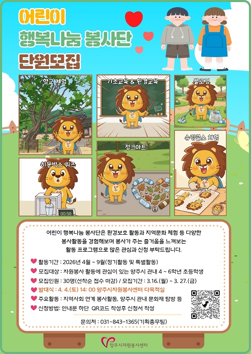 ¾çÁÖ½ÃÀÚ¿øºÀ»ç¼¾ÅÍ´Â ¿À´Â 3¿ù 16ÀϺÎÅÍ 3¿ù 27ÀϱîÁö ‘¾î¸°ÀÌ Çູ³ª´® ºÀ»ç´Ü’¿¡ Âü¿©ÇÒ °ü³» 4~6Çгâ ÃʵîÇлý 30¸íÀ» ¼±Âø¼ø ¸ðÁýÇÑ´Ù°í ¹àÇû´Ù.