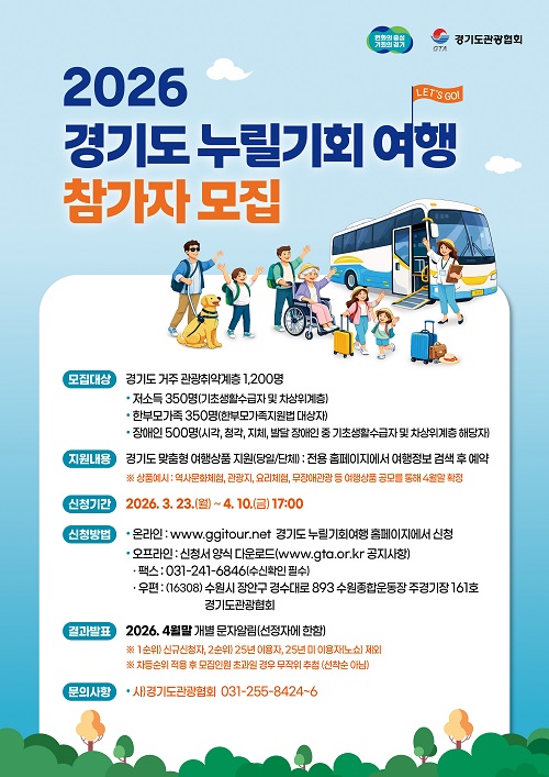 Âü¿©¸¦ Èñ¸ÁÇÏ´Â µµ¹ÎÀº °æ±âµµ´©¸±±âȸ¿©Çà ´©¸®Áý(www.ggitour.net)À» ÅëÇØ ½ÅûÇÒ ¼ö ÀÖÀ¸¸ç, °æ±âµµ°ü±¤Çùȸ ´©¸®Áý(www.gta.or.kr) °øÁö»çÇ×À» Âü°íÇØ ÆÑ½º ¶Ç´Â ¿ìÆíÀ¸·Îµµ Á¢¼öÇÒ ¼ö ÀÖ´Ù.