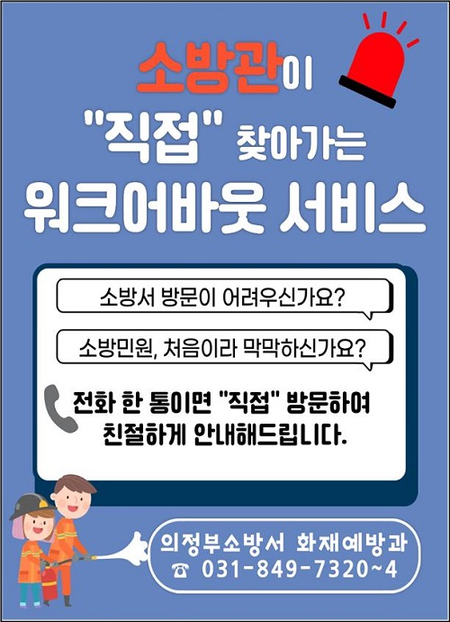 ÀÇÁ¤ºÎ¼Ò¹æ¼´Â ¼Ò¹æ¹Î¿ø ó¸®ÀÇ ½ÇÈ¿¼ºÀ» ³ôÀ̱â À§ÇØ ÇöÀå¿¡¼ Á÷Á¢ ÇØ°áÇÏ´Â ‘¿öÅ©¾î¹Ù¿ô(walk-about) ¼ºñ½º’¸¦ ¿¬Áß ¿î¿µÇÑ´Ù°í ¹àÇû´Ù. À̹ø ½ÃÃ¥Àº ÀüÈ »ó´ã¸¸À¸·Î´Â ¼Ò¹æ °ü·Ã ¹ý·É°ú ÀýÂ÷¸¦ ÃæºÐÈ÷ ÀÌÇØÇϱ⠾î·Á¿î ¹®Á¦¸¦ °³¼±Çϱâ À§ÇØ ÃßÁøµÆ´Ù.
