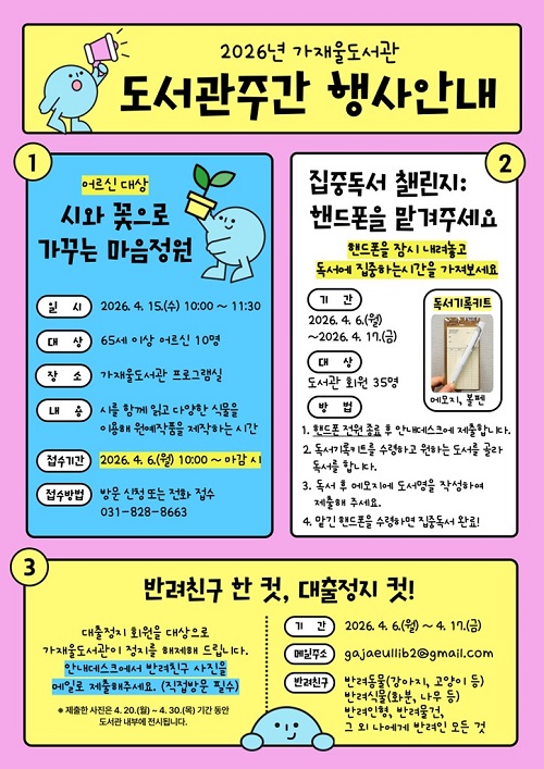 ¶ÇÇÑ µµ¼°ü ÀÌ¿ëÀÚµéÀÇ µ¶¼ ÁýÁßÀ» µ½±â À§ÇÑ Âü¿©Çü À̺¥Æ® ‘ÁýÁßµ¶¼ 縰Áö: ÇÚµåÆùÀ» ¸Ã°ÜÁÖ¼¼¿ä’¸¦ 4¿ù 6ÀϺÎÅÍ 17ÀϱîÁö ¿î¿µÇÑ´Ù. Âü°¡ÀÚ´Â ¾È³»µ¥½ºÅ©¿¡ ÈÞ´ëÀüȸ¦ Àá½Ã ¸Ã±â°í µ¶¼ ±â·Ï ŰƮ¸¦ ¼ö·ÉÇÑ ÈÄ ¿øÇϴ åÀ» °ñ¶ó µ¶¼¸¦ ÇÏ¸é µÈ´Ù.