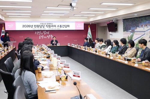 ½Ã´Â Áö³ 23ÀÏ ½Ãû »óȲ½Ç¿¡¼ ¹Î¿ø Á¢Á¡ ºÎ¼ Á÷¿øµé°ú ¹Î¿ø´ã´ç °ø¹«¿ø ¼ÒÅë °£´ãȸ¸¦ ¿°í ÇöÀå ¾Ö·Î»çÇ×°ú Á¦µµ °³¼± Çʿ伺À» Á¡°ËÇß´Ù°í ¹àÇû´Ù.