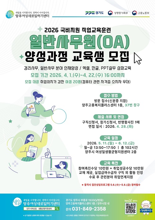 ¾çÁֽð¡ ¿À´Â 4¿ù 1ÀϺÎÅÍ 4¿ù 22ÀϱîÁö ¾çÁÖ¿©¼º»õ·ÎÀÏÇϱ⼾ÅÍ¿¡¼ Á÷¾÷±³À°ÈÆ·Ã ‘ÀϹݻ繫¿ø(OA) ¾ç¼º°úÁ¤’ ±³À°»ýÀ» ¸ðÁýÇÑ´Ù.