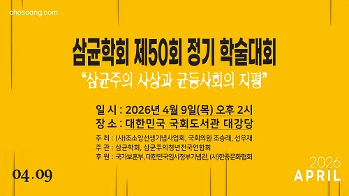 »ï±ÕÇÐȸ Á¦50ȸ Á¤±âÇмú´ëȸ°¡ ±¹È¸µµ¼°ü ´ë°´ç¿¡¼ ¿¸°´Ù. À̹ø Çмú´ëȸ´Â Á¶¼Ò¾Ó¼±»ý±â³ä»ç¾÷ȸ, Á¶½Â·¡ ±¹È¸ÀÇ¿ø½Ç, ¼±¿ìÀç°¡ °øµ¿ ÁÖÃÖÇϰí, »ï±ÕÇÐȸ¿Í »ï±ÕÁÖÀÇû³â¿¬ÇÕȸ°¡ ÁÖ°üÇϸç, ±¹°¡º¸ÈƺÎ, ±¹¸³´ëÇѹα¹ÀÓ½ÃÁ¤ºÎ±â³ä°ü, ÇÑÁß¹®ÈÇùȸ°¡ ÈÄ¿øÇÑ´Ù.