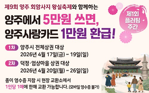 À̹ø ‘2026³â Á¦1ȸ Ç÷¯ÆÃ ÁÖ°£’Àº 4¿ù 17ÀϺÎÅÍ 19ÀϱîÁö ÁøÇàµÈ´Ù. ¾çÁֽà Àü¿ª ¶Ç´Â ¿Õ½ÇÃàÁ¦ Çà»çÀå ³»¿¡¼ ¼ÒºñÇÑ ¿µ¼öÁõÀ» Çà»çÀå ³» ±³È¯¼Ò¿¡ Á¦ÃâÇϸé, °áÁ¦ ±Ý¾×ÀÇ 20%(1Àδç ÃÖ´ë 1¸¸ ¿ø)¸¦ ¾çÁÖ»ç¶ûÄ«µå·Î ÇöÀå¿¡¼ ȯ±ÞÇØ ÁÖ´Â ¹æ½ÄÀ¸·Î ÁøÇàµÈ´Ù. ´Ü, ÇÕ»ê±Ý¾×ÀÌ 5¸¸ ¿ø ÀÌ»óÀÎ °æ¿ì¿¡ ÇÑÇØ Áö±ÞµÇ¸ç, ÁغñµÈ ¿¹»ê ¼ÒÁø ½Ã Á¶±â Á¾·áµÉ ¼ö ÀÖ´Ù.