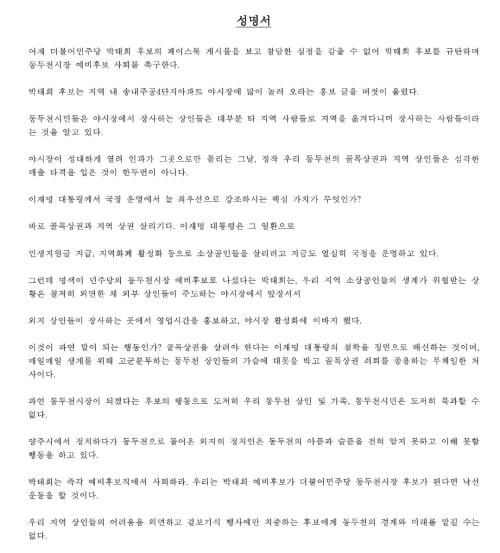 µ¿µÎõ Å«½ÃÀå»óÀÎȸ, ½Å½Ã°¡Áö»óÀÎȸ, À¯Èï»óÀÎȸ, ÀÚµ¿Â÷»óÀÎȸ ¼Ò¼Ó 200¿©¸íÀÌ ³Ñ´Â »óÀεéÀº 4¿ù16ÀÏ ¼º¸í¼¸¦ ¹ßÇ¥ÇÏ°í “¾îÁ¦ ¹ÎÁÖ´ç ¹ÚÅÂÈñ Èĺ¸ÀÇ ÆäÀ̽ººÏ °Ô½Ã¹°À» º¸°í Âü´ãÇÑ ½ÉÁ¤À» °¨Ãâ ¼ö ¾ø¾î ±ÔźÇÏ¸ç ¿¹ºñÈĺ¸ »çÅ𸦠Ã˱¸ÇÑ´Ù”°í Çß´Ù.