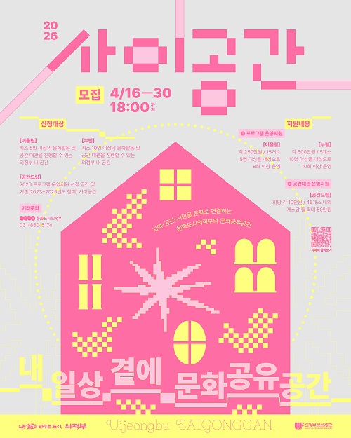 ÀÇÁ¤ºÎ¹®ÈÀç´Ü(´ëÇ¥ÀÌ»ç ¹ÚÈñ¼º)Àº ‘15ºÐ ¹®È»ýȰ±Ç’ Á¶¼ºÀ» À§ÇÑ 2026 ¹®È °øÀ¯°ø°£ Áö¿ø»ç¾÷ ‘»çÀ̰ø°£’ Âü¿© °ø°£À» ¿À´Â 30ÀÏ ¿ÀÈÄ 6½Ã±îÁö ¸ðÁýÇÑ´Ù°í ¹àÇû´Ù.