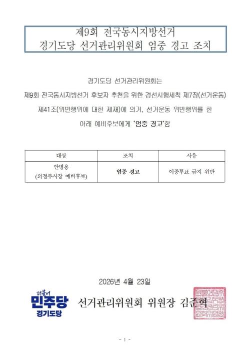 ¹ÎÁÖ´ç °æ±âµµ´ç ¼±°Å°ü¸®À§¿øÈ¸´Â 4¿ù23ÀÏ “°æ¼±½ÃÇ༼Ģ Á¦7Àå(¼±°Å¿îµ¿) Á¦41Á¶(À§¹ÝÇàÀ§¿¡ ´ëÇÑ Á¦Àç)¿¡ ÀǰÅ, ¼±°Å¿îµ¿ À§¹ÝÇàÀ§¸¦ ÇÑ ¾Èº´¿ë ¿¹ºñÈĺ¸¿¡°Ô ‘¾öÁß °æ°í’ÇÑ´Ù”°í ¹ßÇ¥Çß´Ù.